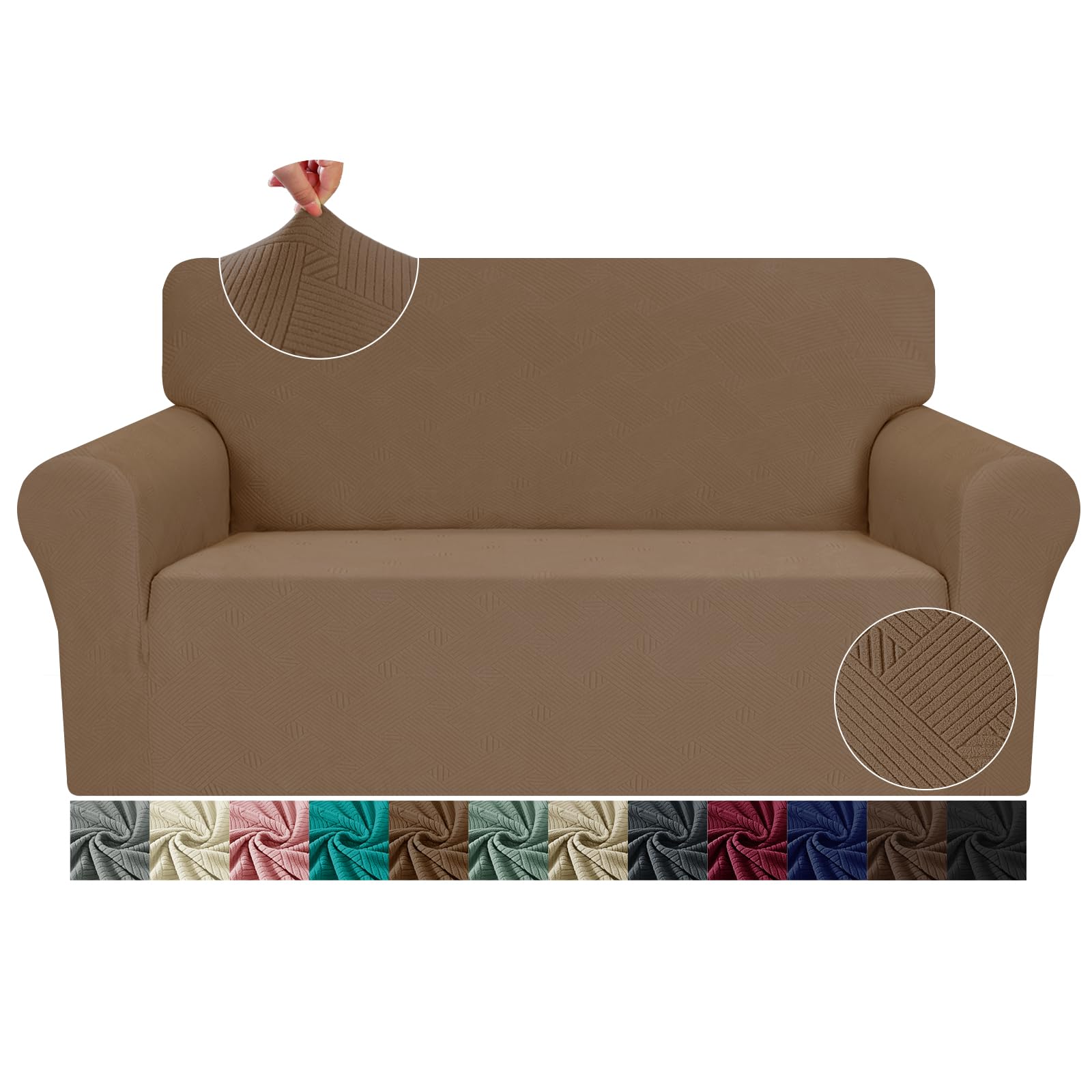 JIVINER Loveseat Slipcovers, 1 Piece Stretch Couch Covers for 2 Cushion Furniture Protector with Elastic Bottom for Kids Pets Jacquard 2 Seater Sofa Cover (Loveseat, Brown)