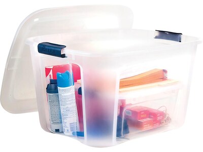 Description Control clutter in your office, stockroom, or supply closet with this Bella Storage Solutions 71-quart locking-lid tote. Protect supplies, parts, or inventory with this locking lid container. The durable clear plastic construction withstands daily use, while makes it easy to see the contents stored inside. A locking latch system keeps the lid securely in place, preventing items from falling out when this container is moved. Featuring a sleek design, this Bella Storage Solutions container makes a smart addition to customer-facing spaces. This storage tote is a great way to keep playrooms, bedrooms, and closets organized with a portable, stackable solution you can carry with you Clear plastic construction features reinforced corners for added durability and provides easy identification of contents Durable latches snap easily in place to secure the content Stacking feature helps take advantage of every inch of storage space making tote great for storing clothing, linens, toys, seasonal decorations, and more 71 qt. capacity is perfect for larger storage needs Dimensions: 13.5"H x 18.75"W x 23.25"D Features convenient buckle-up latched handles Storage totes are sold individually Contemporary design will enhance your shelf appeal Can also be used for additional functions including: camping, picnics, garage storage, and moving Specifications Color Family : Clear Bin & Tote Material : Plastic Height in Inches : 13.5 Width in Inches : 18.75 Latching : Latching Brand : Bella Storage Solutions Quick Ship : Yes Customizable : No Weight : 3.34 lbs. per Each