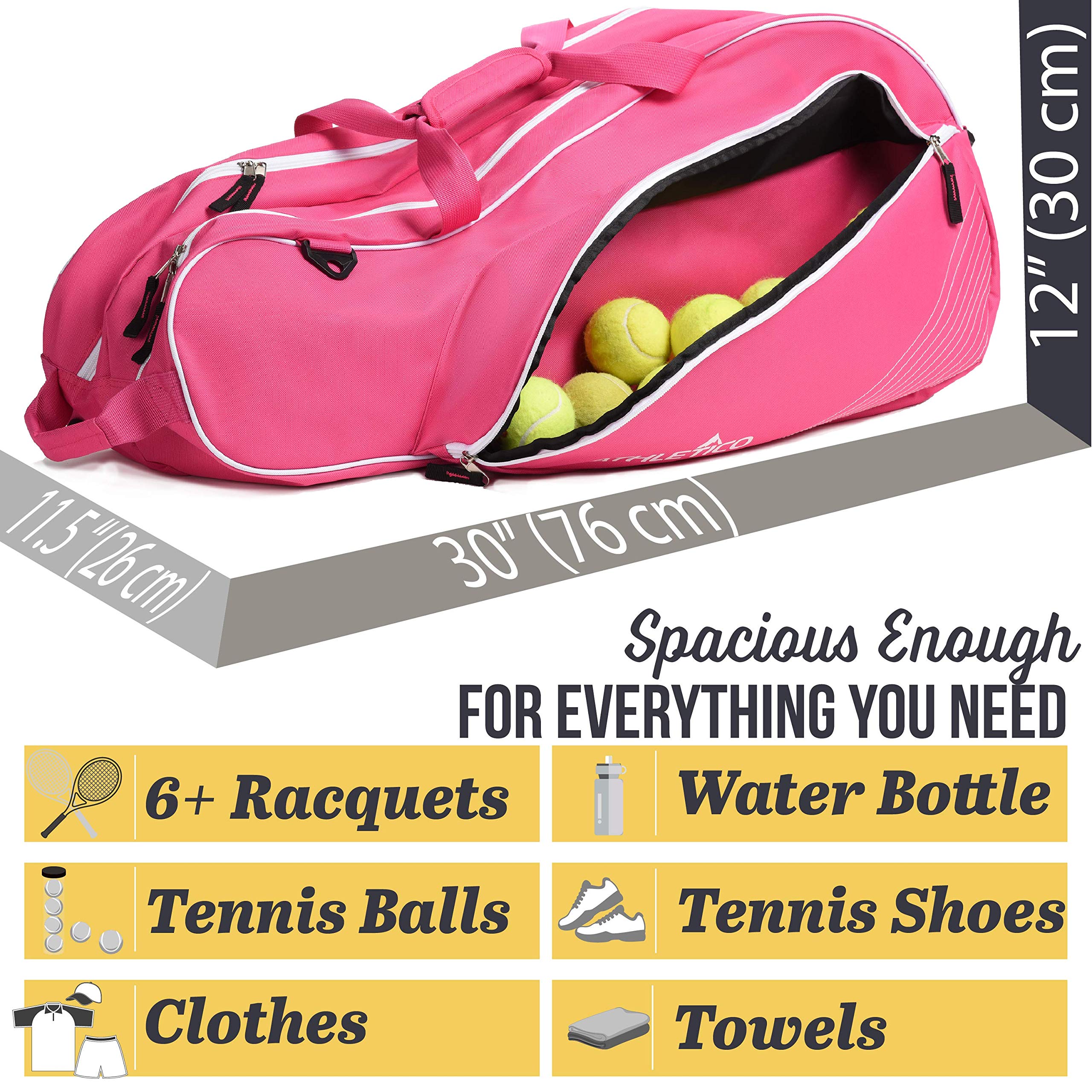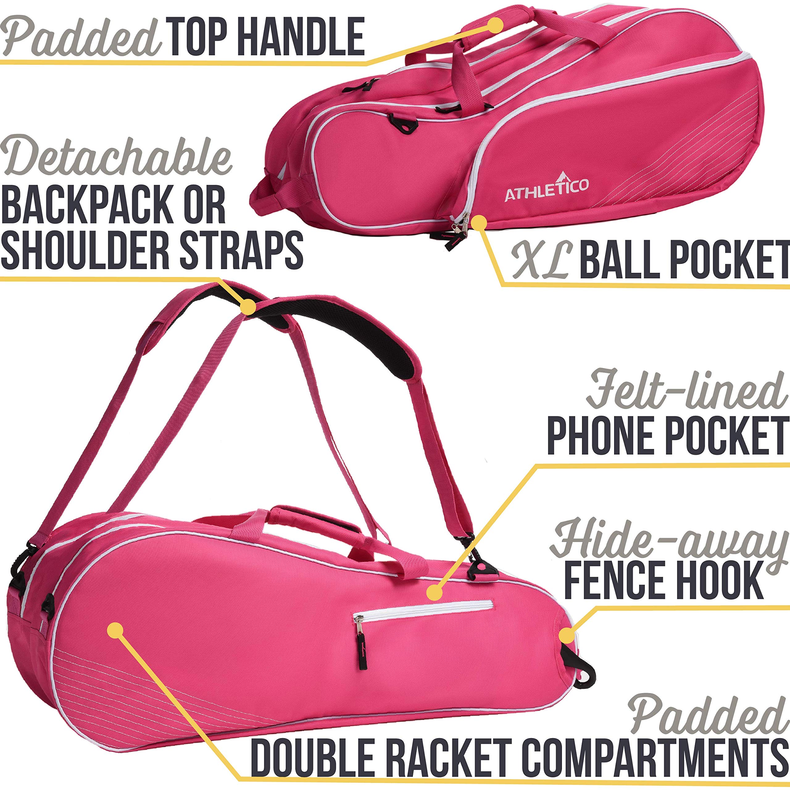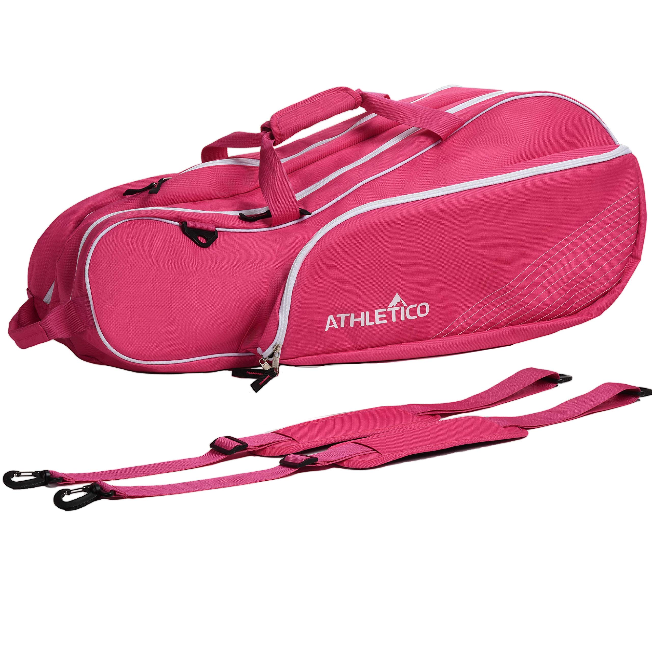 The Athletico 6 Racquet Tennis Bag is a lightweight, unisex tennis bag designed to hold up to six rackets and all your essential gear. Featuring multiple carrying options including backpack straps and shoulder clips, a felt-lined tech pocket for electronics, and a convenient fence hook, itโs perfect for players of all skill levels seeking both protection and style on and off the court.