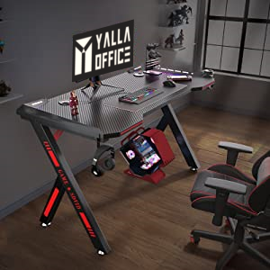 The Yalla Office Gaming Table features a durable carbon fiber surface with anti-scratch and water-heat resistant properties, supported by a heavy-duty steel frame. Its R-shaped ergonomic design enhances comfort, while integrated blue LED lighting powered via USB adds immersive ambiance. The package includes four essential gaming accessories for organization, making it a complete setup for serious gamers seeking style and functionality.