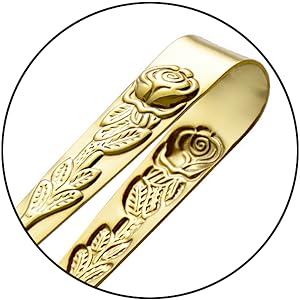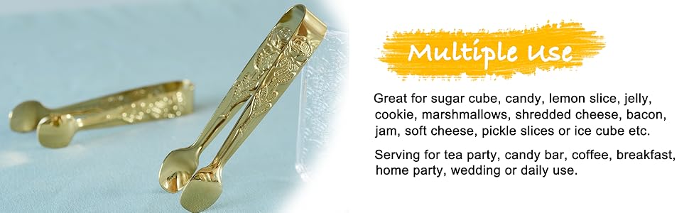This 6-piece set of 4.13-inch mini serving tongs combines premium stainless steel durability with an elegant rose handle design. Perfectly sized for sugar cubes, appetizers, and delicate foods, these corrosion-resistant gold tongs offer adjustable grip flexibility and versatile use for parties, weddings, and daily entertaining.
