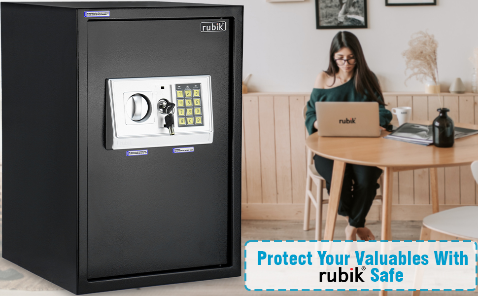 The Rubik Safe Box Large is a fire-resistant security safe designed for home or office use, featuring a digital combination lock with emergency keys, durable alloy steel construction, and versatile mounting options. Measuring 50x35x30 cm and weighing 15.3 kg, it comes fully equipped with batteries and installation hardware for immediate, reliable protection of your valuables.
