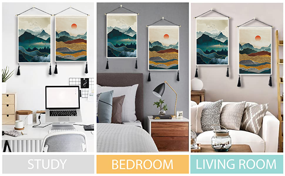 The ORTIGIA 2 Pack Japanese Mountain Tapestry features 100% linen fabric with advanced HD printing for vibrant, fade-resistant colors. Measuring 14" x 20" (35cm x 50cm), these lightweight tapestries include tassels and all necessary hardware for easy hanging. Ideal for enhancing bedrooms, offices, dorms, or living rooms with a serene misty forest aesthetic, they are machine washable and suitable for year-round use.