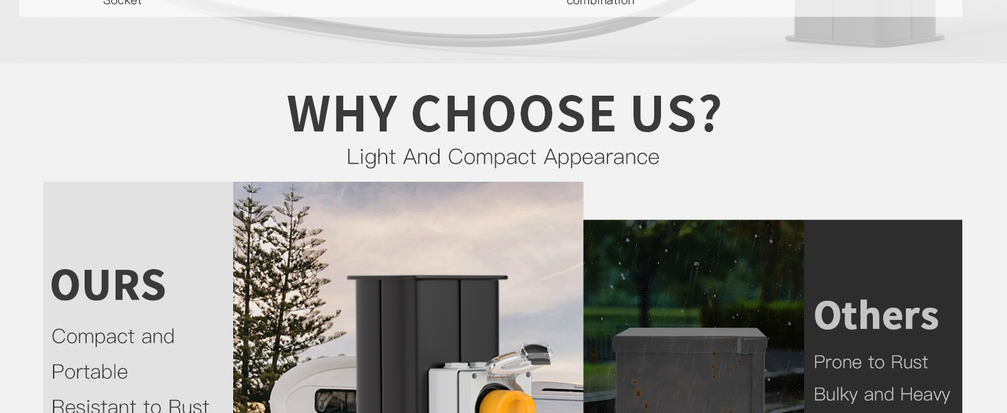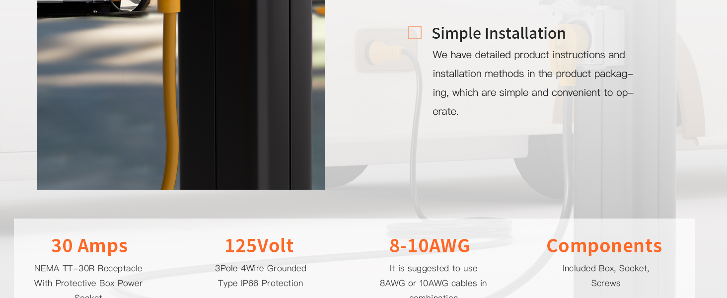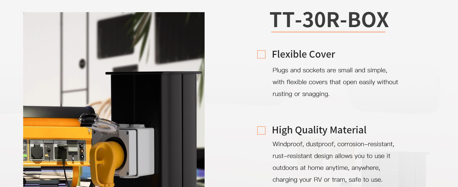 This 30Amp, 125Volt NEMA TT-30R power outlet box features an IP66-rated dustproof and weatherproof enclosure made from high-quality PP and PVC materials. ETL Listed for safety, it supports high-power devices like electric vehicles, welding machines, generators, and RVs, combining durability with universal compatibility for reliable outdoor use.