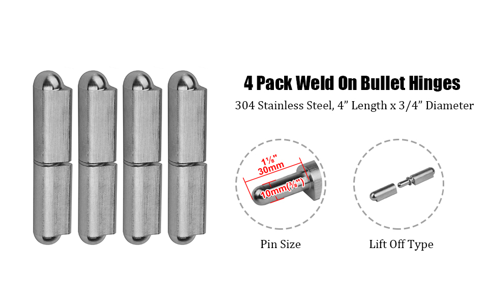 The MOUNTAIN_ARK 4 Pack Weld On Bullet Hinges are precision-engineered 4" x 3/4" stainless steel 304 hinges featuring a brushed finish, 360° rotation, and a robust 440 lbs load capacity per pair. Designed for heavy-duty applications like swing gates, trailer ramps, and doors, this pack includes four durable, weldable barrel hinges with a 3/8" diameter pin, ensuring long-lasting performance and smooth operation.