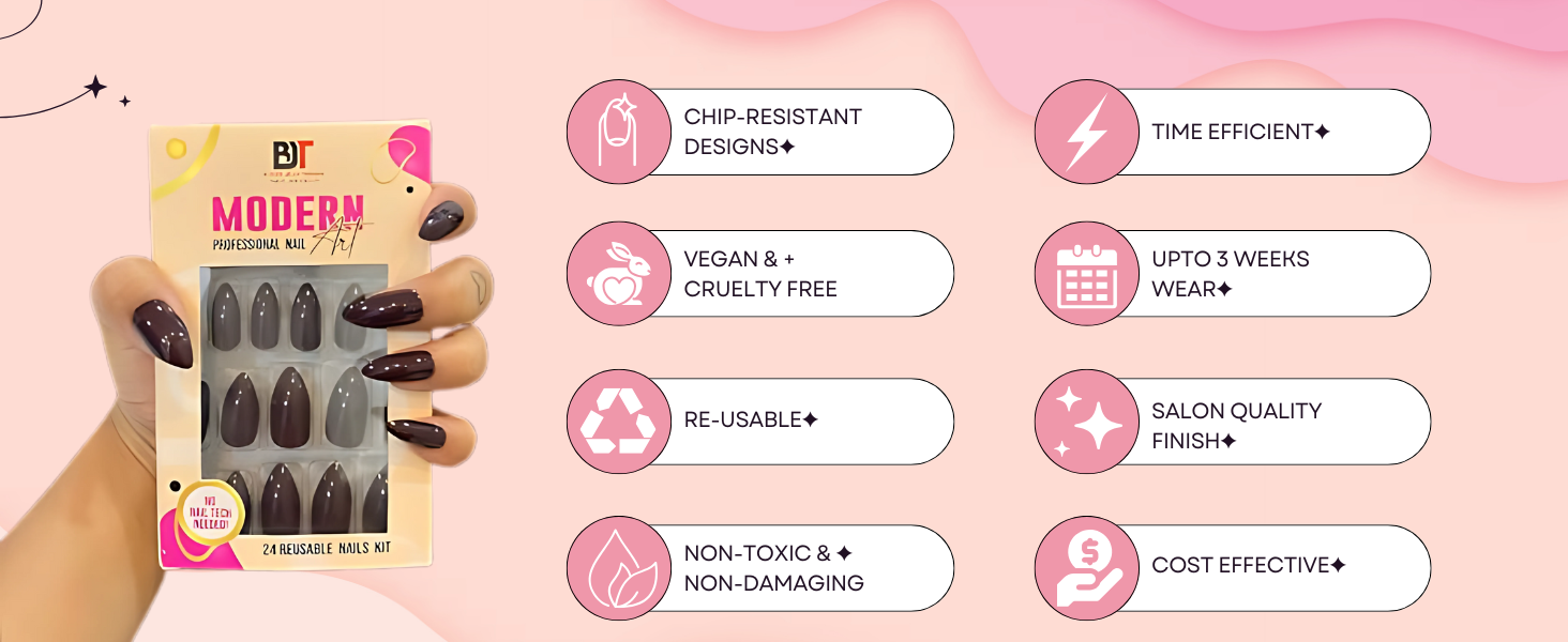 Buddy Jelly Trends Premium Designer 24pcs Stick-on Nails set offers a salon-quality gel polish finish with 24 ultra-thin, unbreakable Korean ABS nails. The kit includes easy-to-use glue tabs and liquid glue for a secure, reusable fit, plus tools for perfect application and removal. Designed for effortless, professional-looking manicures at home or on the go.