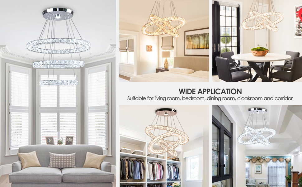 This Modern LED Crystal Chandelier features three adjustable acrylic and crystal rings in warm white light (2500K-3500K), powered by an energy-efficient 40W integrated LED. Designed with polished stainless steel and premium materials, it offers customizable height (12-48 inches) and a sleek, contemporary look ideal for bedrooms, dining rooms, hallways, and offices.