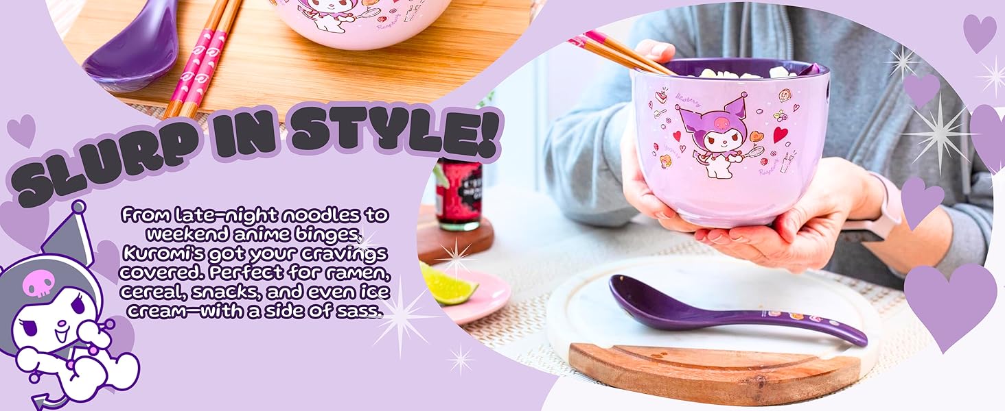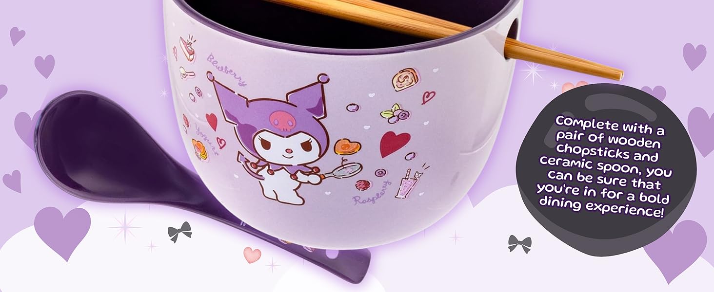 This officially licensed Sanrio Kuromi ramen dinnerware set features a 20-ounce BPA-free ceramic bowl, a matching ceramic spoon, and wooden chopsticks. Designed for durability and convenience, the bowl and spoon are microwave and dishwasher safe, while the chopsticks require hand washing. Perfect for noodles, soups, and more, this purple-themed set combines playful design with practical functionality for everyday meals or collectible display.