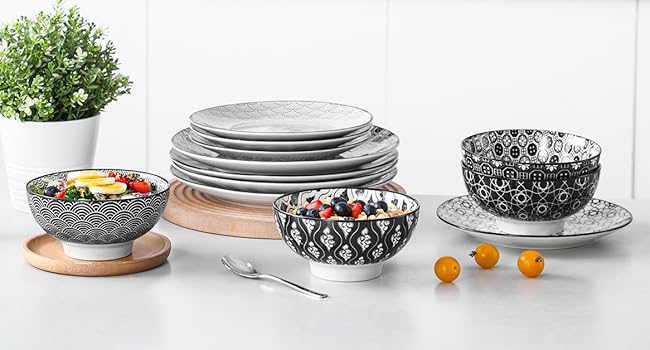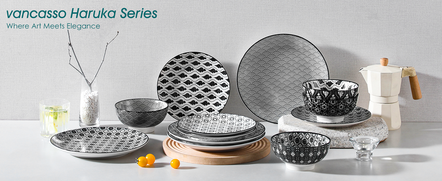 The vancasso Haruka 12 Pieces Plates and Bowls Set is a beautifully crafted ceramic dinnerware set designed for four, featuring elegant black and white designs inspired by traditional Japanese aesthetics. This versatile set is perfect for any dining occasion, ensuring both style and durability with its high-quality materials. Microwave and dishwasher safe, it combines convenience with timeless elegance.
