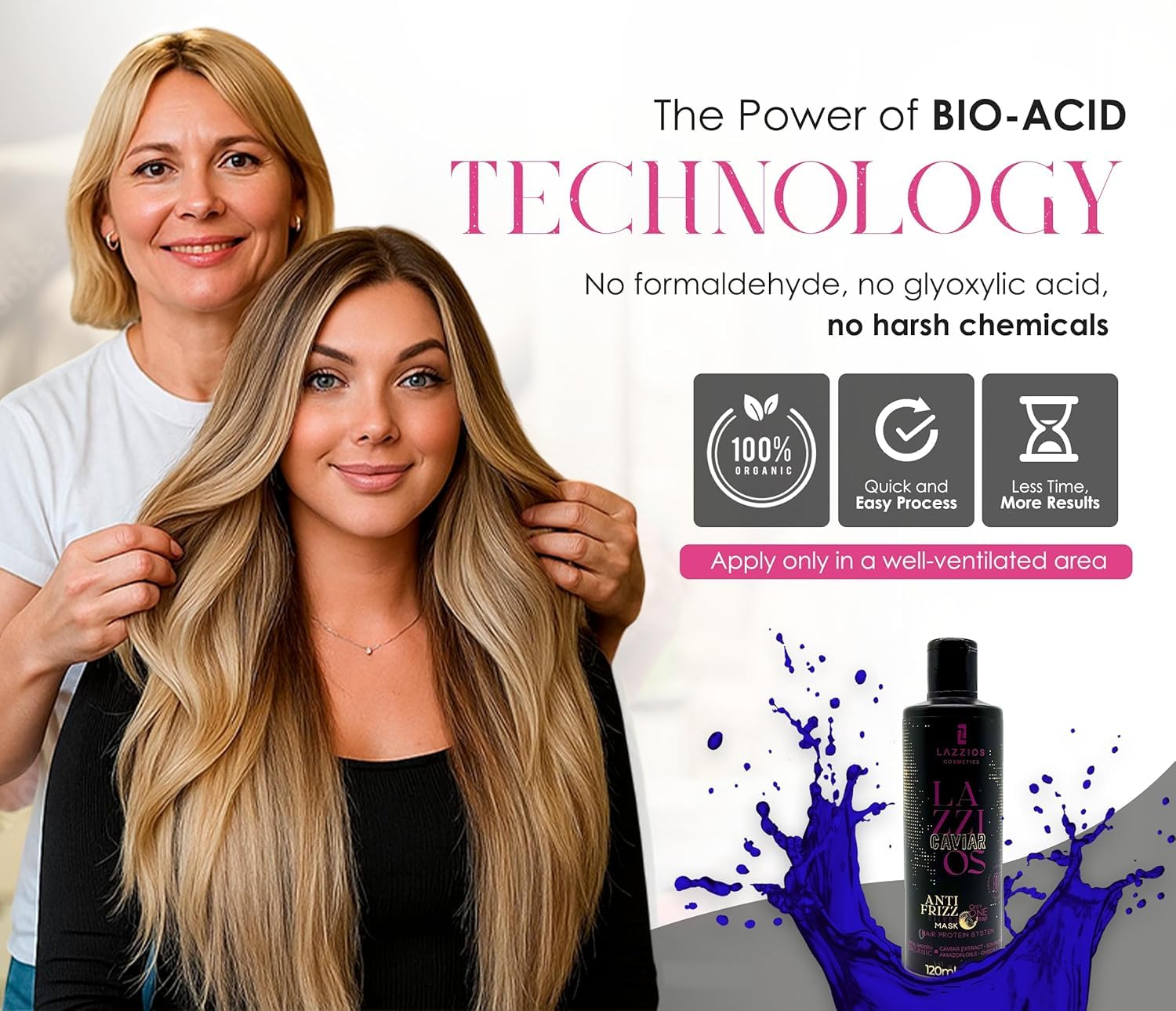 Lazzios Caviar Organic Hair Protein is a Brazilian straightening treatment that delivers up to 6 months of frizz-free, hydrated, and silky hair using a formaldehyde-free organic formula enriched with hyaluronic acid, hydrolyzed keratin, and caviar extract. Its innovative Bio-Acid Technology ensures smoothness without damaging natural hair bonds, making it safe for sensitive users and professionals alike.