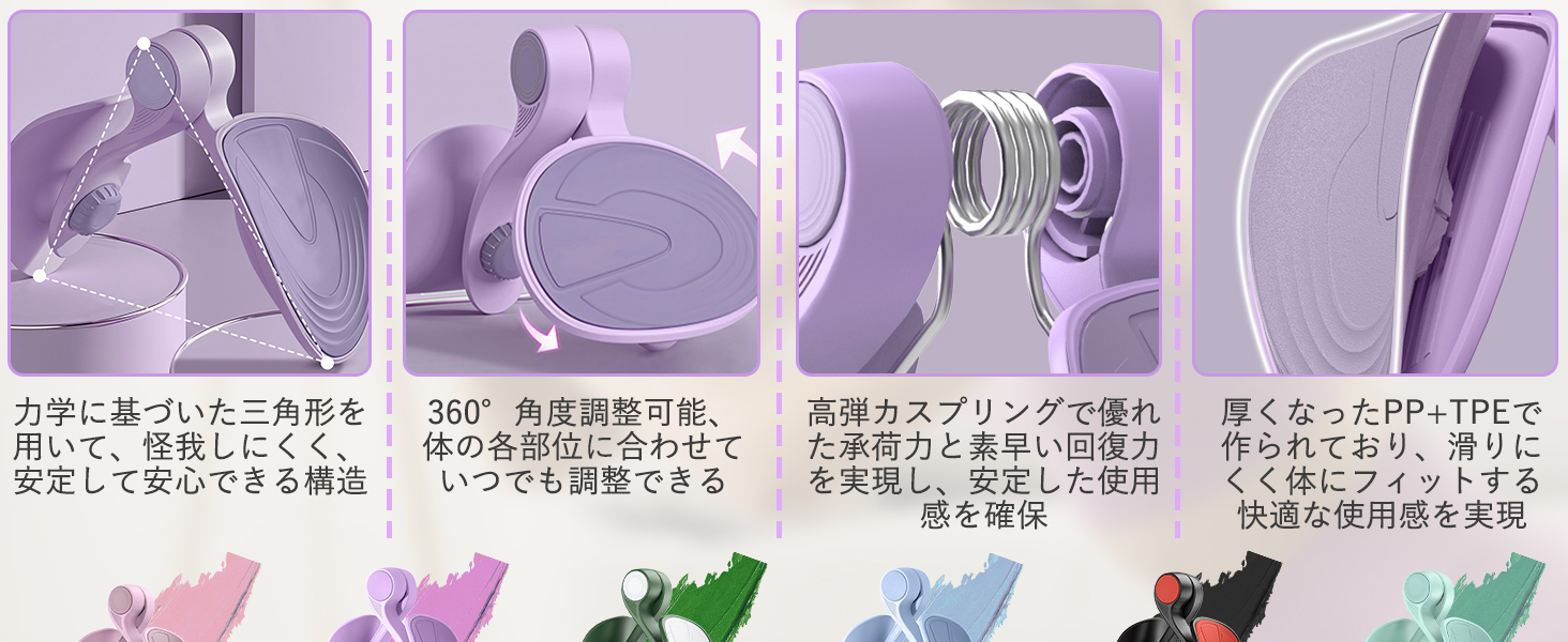 自宅で簡単にトレーニングができるのでとても便利です。太ももやヒップに効くので下半身の引き締めが期待できると思いました。軽いのに安定感があり、持ち運びも簡単なので自宅の好きな場所で使用できます。付属のバンドもセットで使うとより効果がありました。