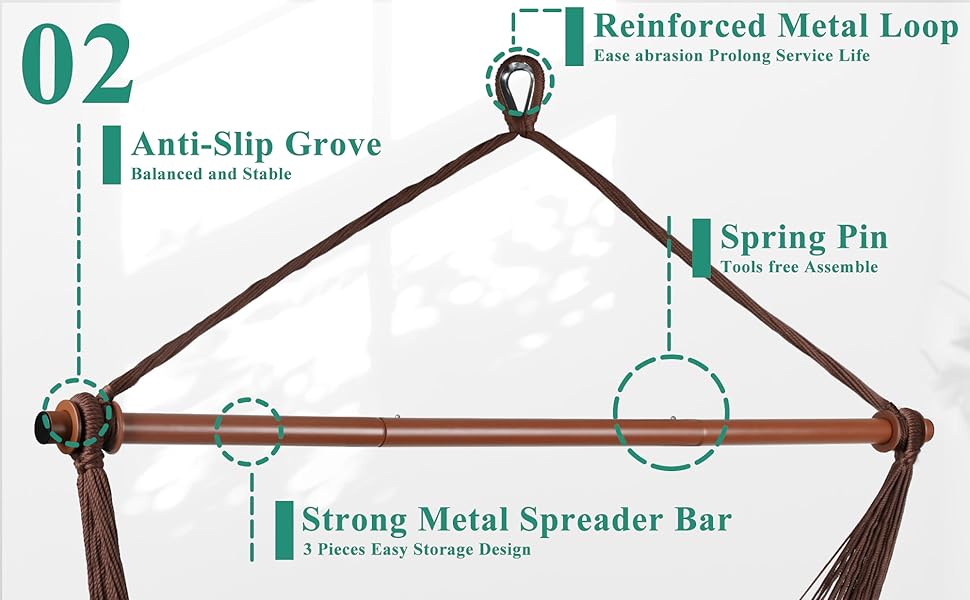 The Upgraded Caribbean Hammock Chair features a durable three-section detachable steel bar with anti-slip grooves, a large handwoven 100% polyester fabric seat designed for full-body comfort, and supports up to 330 lbs. Lightweight and easy to assemble without tools, it’s perfect for both indoor and outdoor relaxation, combining portability with premium durability.