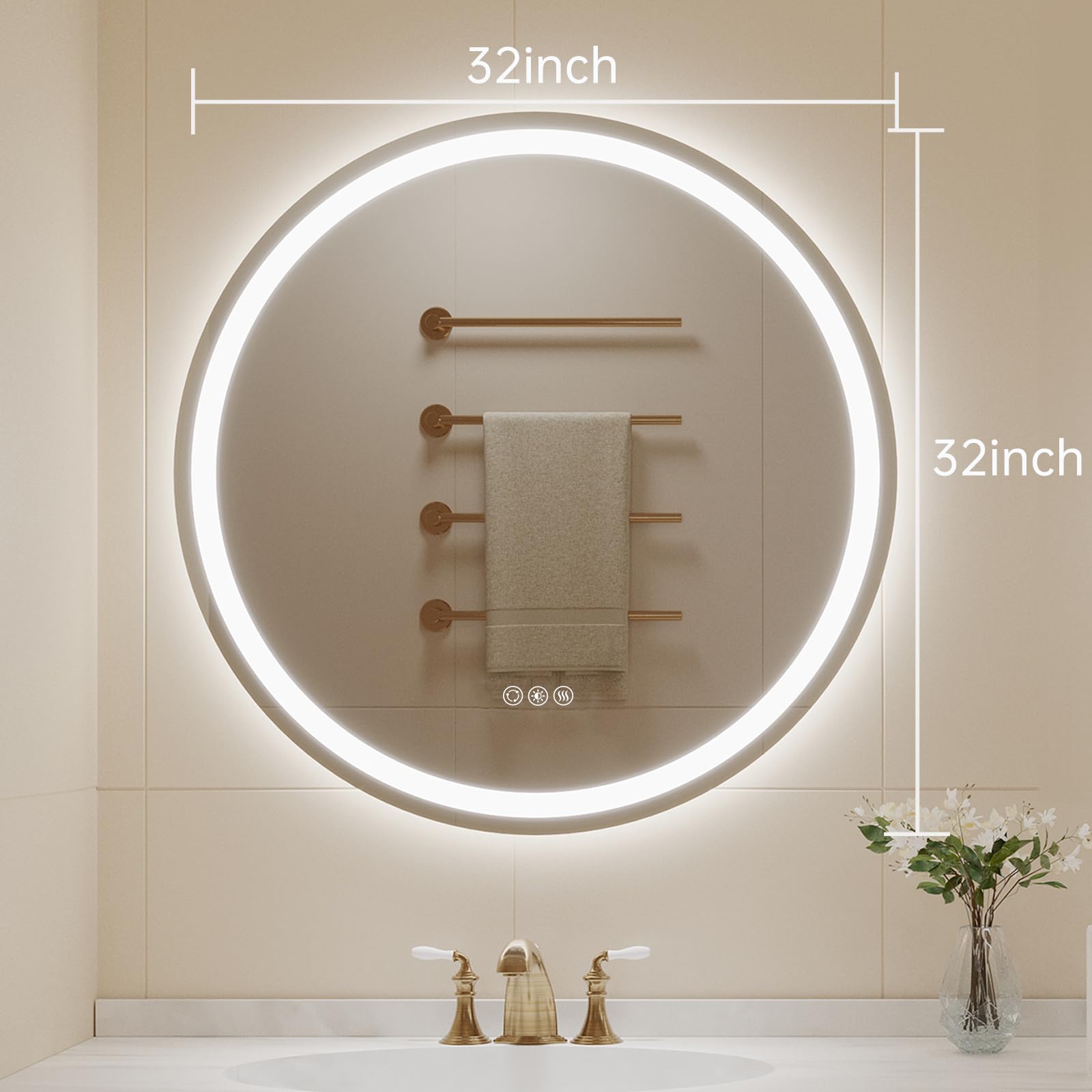 The LOVESPEJO 32" Round LED Bathroom Mirror features a high-density 240 LEDs/meter strip with over 50,000 hours lifespan, offering three adjustable color temperatures (3000K, 4500K, 6000K) and dimmable brightness from 10% to 100%. Its advanced anti-fog technology ensures a clear reflection even in steamy conditions. Easy to install with plug-in or hardwired options, it comes with a 3-year warranty for reliable, stylish bathroom illumination.